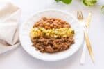CARNE DESFIADA COM ARROZ BRANCO, FEIJÃO E ABOBRINHA