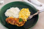 Coxa de sobrecoxa desossada sem antibiótico, marinada ao alho, cebola, vinho branco e sal; após algumas horas, colocamos no forno até dourar. Creme de milho feito com creme de leite fresco e milho direto da espiga.