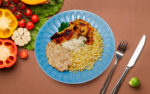 Nossa sobrecoxa de frango é feita com temperos naturais, acompanha arroz branco , feijão e cenoura. 300g